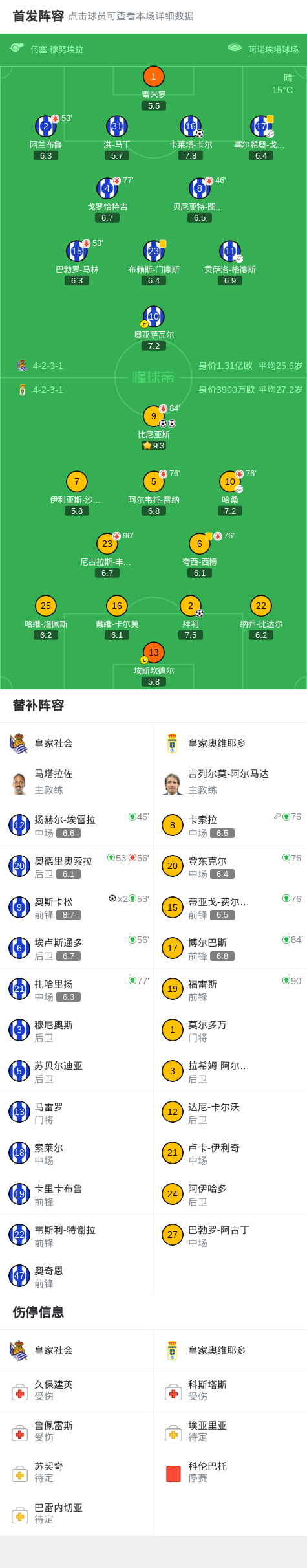 第50分钟,皇家奥维耶多球员哈桑助攻比尼亚斯打入一球。