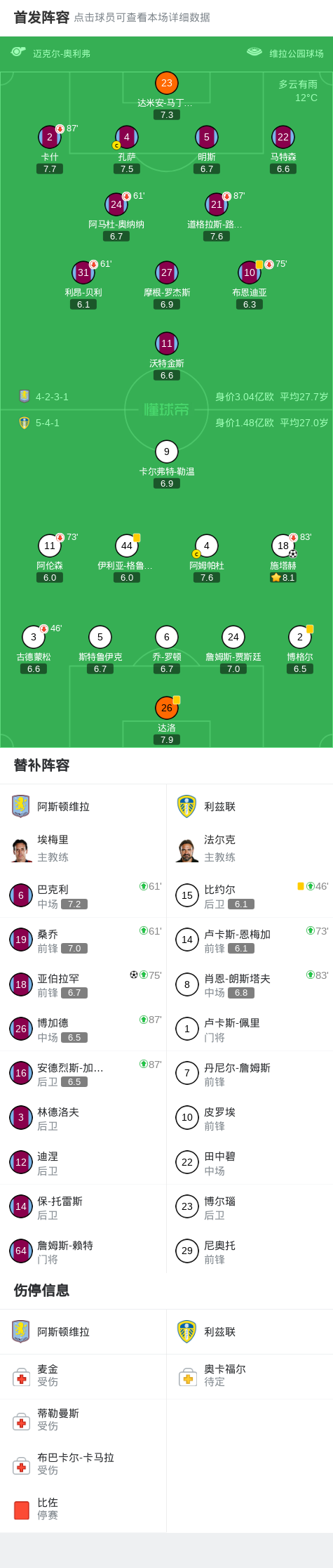 02-21 22:05阿斯顿维拉vs利兹联:达米安-马丁内斯、沃特金斯首发,卡尔弗特-勒温、阿姆帕杜出战