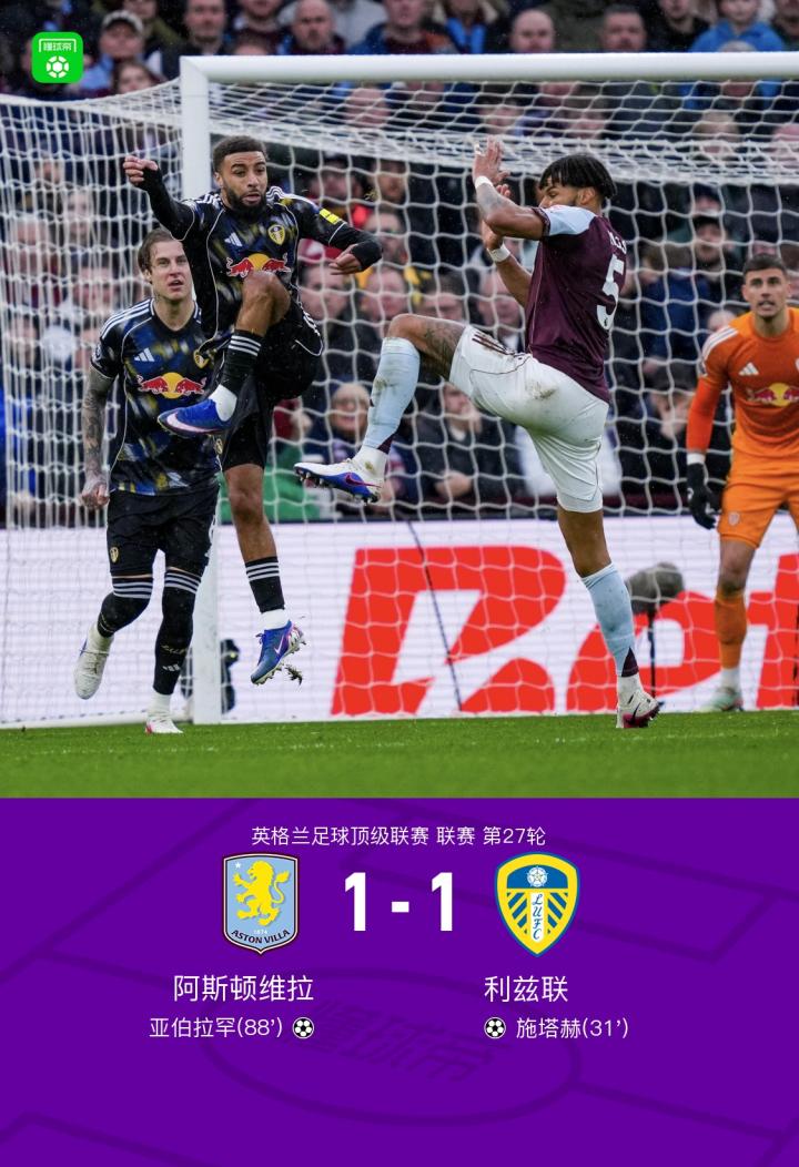扫描下载懂球帝首页>动态> 阿斯顿维拉1-1利兹联,施塔赫任意球破门,亚伯拉罕扳平