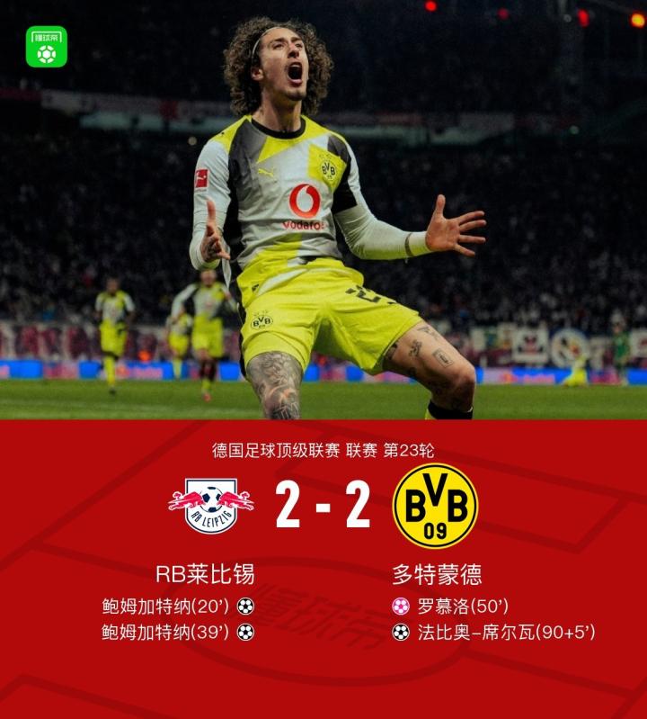 扫描下载懂球帝首页>动态> 剑南春|多特2-2莱比锡,法比奥-席尔瓦绝平,鲍姆加特纳双响
