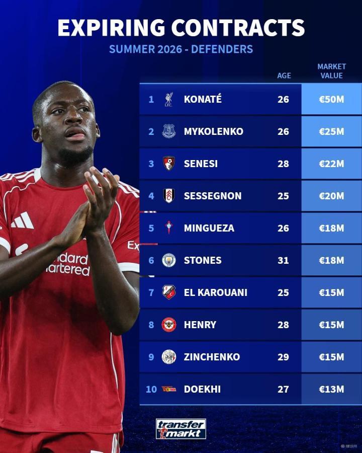 扫描下载懂球帝首页>动态> 德转列今夏合同到期的十大后卫:科纳特、斯通斯、津琴科在列