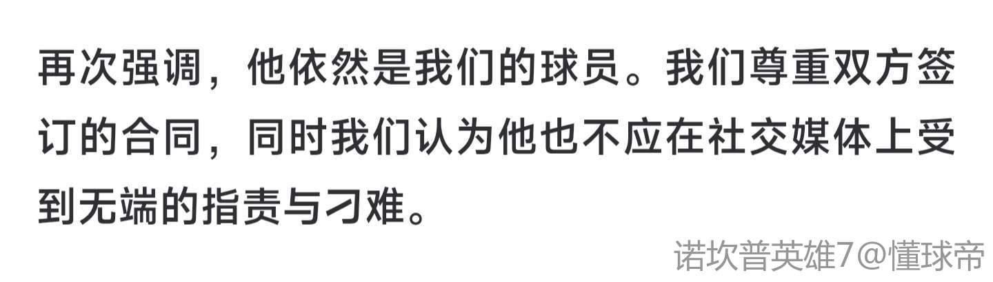 再次强调,他依然是我们的球员。我们尊重双方签订的合同,同时我们认为他也不应在社交媒体上受到无端的指责与刁难。