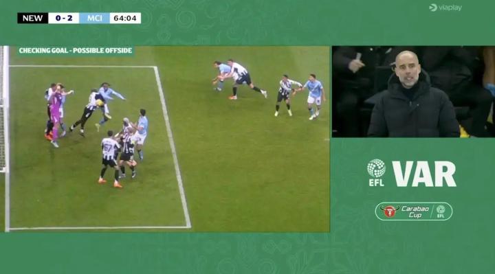 上个月英格兰联赛杯半决赛首回合中,主角还是曼城和纽卡。塞门约打进第二球后,VAR需要判定哈兰德是否存在越位获利行为。然后意外发生了,半自动越位系统彻底失灵,无法完成位置分析,视频助理裁判只能通过人工画线完成判罚,进球无效。