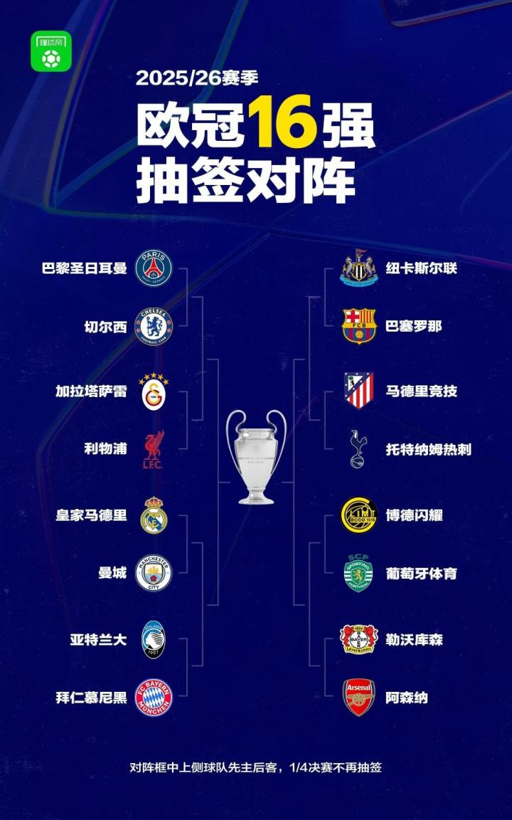 02-26 06:38欧冠淘汰赛16强对阵:曼城vs皇马,切尔西vs巴黎,纽卡vs巴萨