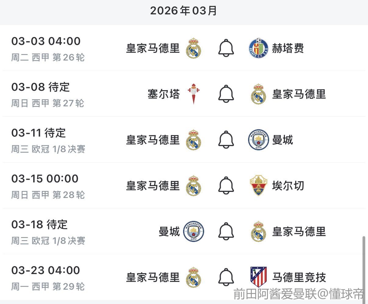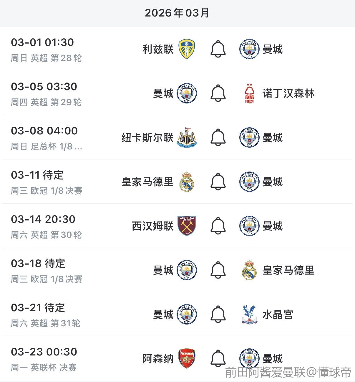 02-27 19:35曼城将迎魔鬼赛程:3月下旬开始连战皇马、枪手、蓝军、枪手