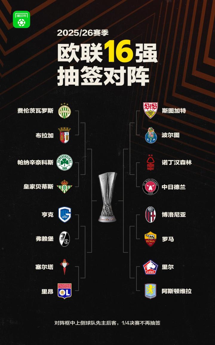 扫描下载懂球帝首页>动态> 欧联淘汰赛16强对阵:维拉vs里尔,罗马博洛尼亚意甲内战