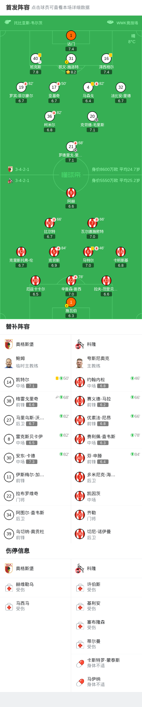 北京时间2月28日德国足球顶级联赛 联赛 第24轮,奥格斯堡主场对阵科隆。奥格斯堡罗德里戈-里贝罗破门,克劳德-毛里斯破门。最终比分奥格斯堡 2-0 科隆。