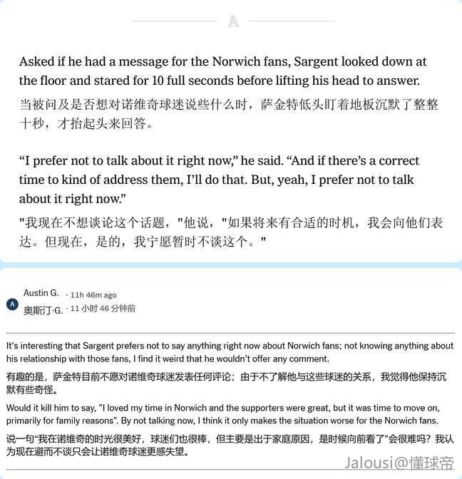 诺维奇不是不愿意谈,但多伦多一直开不出理想的价格,导致双方谈判一度陷入僵局。萨金特又以孩子为由罢训,若不是克莱门特的神奇用人,诺维奇恐怕都很难出降级区。