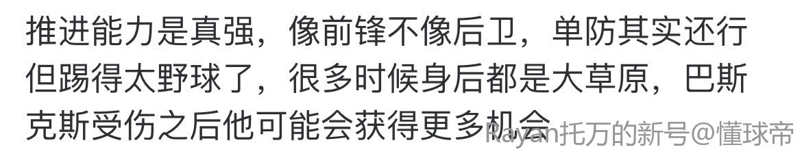 推进能力是真强,像前锋不像后卫,单防其实还行但踢得太野球了,很多时候身后都是大草原,巴斯克斯受伤之后他可能会获得更多机会