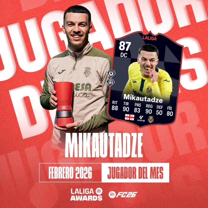 扫描下载懂球帝首页>动态> 4场3球1助,比利亚雷亚尔前锋米卡塔泽当选西甲2月最佳球员