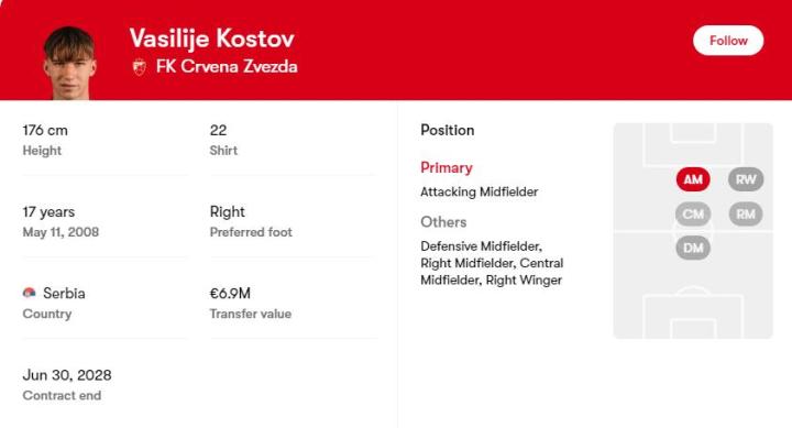 目前,科斯托夫已经吸引了巴塞罗那、拜仁、阿森纳、国际米兰、AC米兰的注意力,贝尔格莱德红星总监更是将他与同年龄段的斯坦科维奇相提并论,并认为他将会破俱乐部的转会记录。