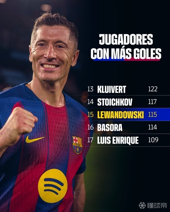 扫描下载懂球帝首页>动态> 115球,莱万超越名宿巴索拉独占巴萨队史射手榜第15名