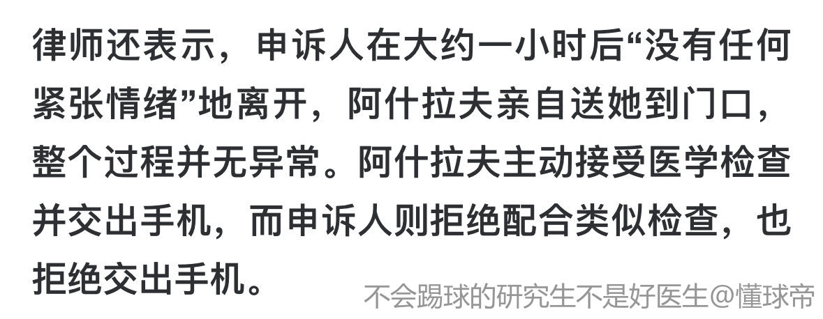 律师还表示,申诉人在大约一小时后“没有任何紧张情绪”地离开,阿什拉夫亲自送她到门口,整个过程并无异常。阿什拉夫主动接受医学检查并交出手机,而申诉人则拒绝配合类似检查,也拒绝交出手机。