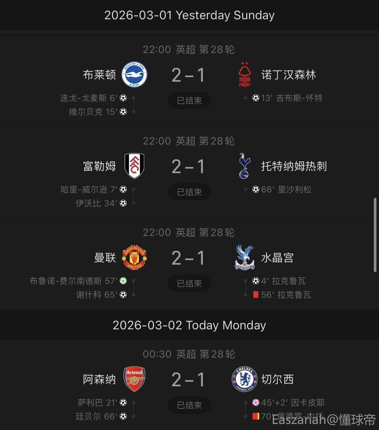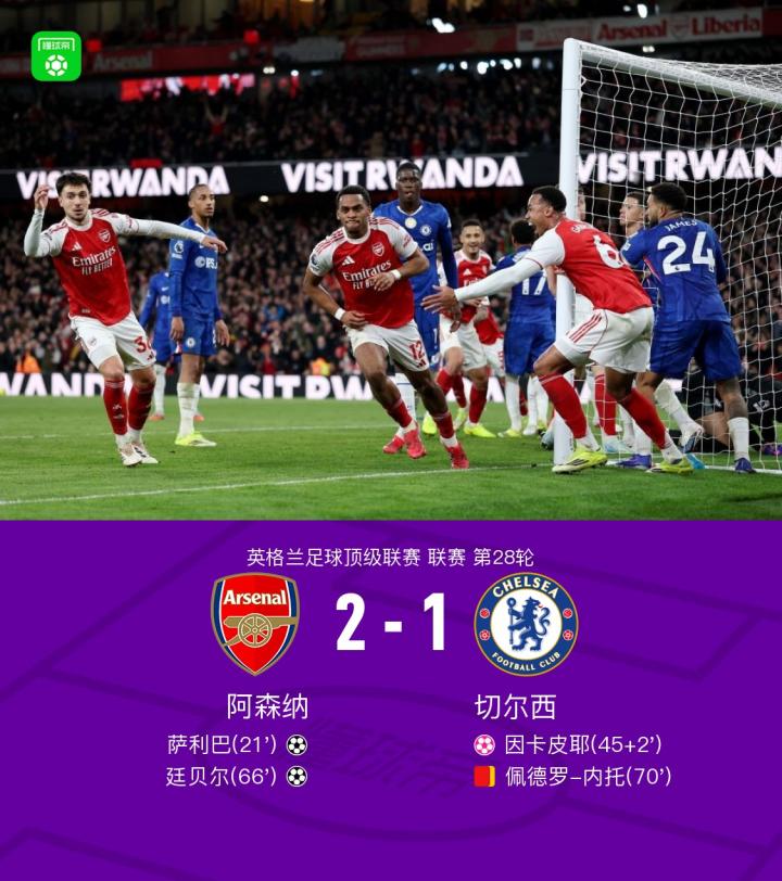 北京时间3月2日英格兰足球顶级联赛 联赛 第28轮,阿森纳主场对阵切尔西。上半场,萨利巴破门。半场补时阶段,詹姆斯开出角球,因卡皮耶不慎自摆乌龙。下半场,阿森纳开出角球,廷贝尔建功。随后,内托铲倒马丁内利拿到第二张黄牌被罚下。全场比赛结束,阿森纳2-1击败十人切尔西。