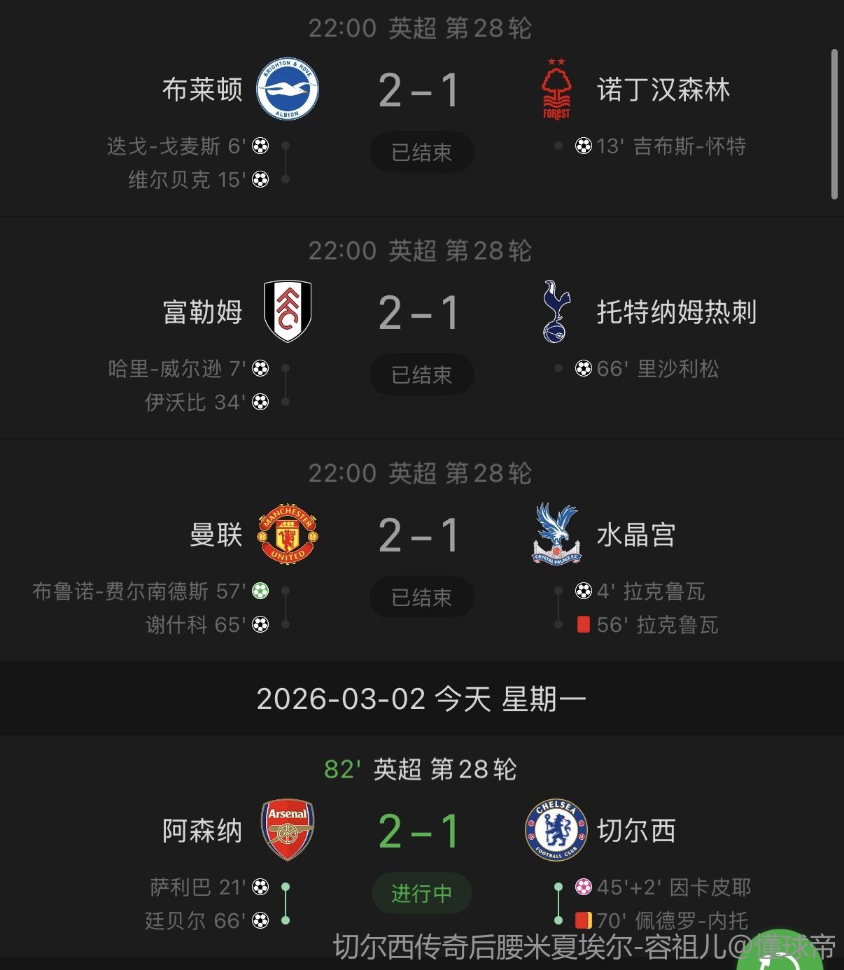 第45+2分钟,因卡皮耶不慎将角球顶进自家球门,切尔西1-1扳平!