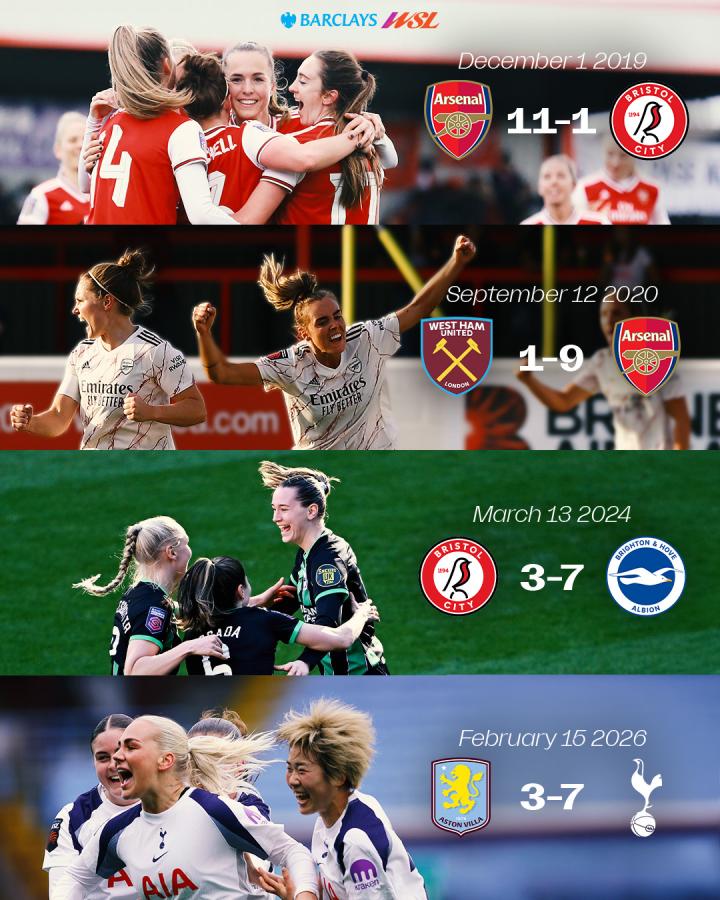 进球!进球!进球!在巴克莱女子超级联赛的历史上,只有四场比赛的单场进球数达到或超过10个,阿森纳女足独占两场