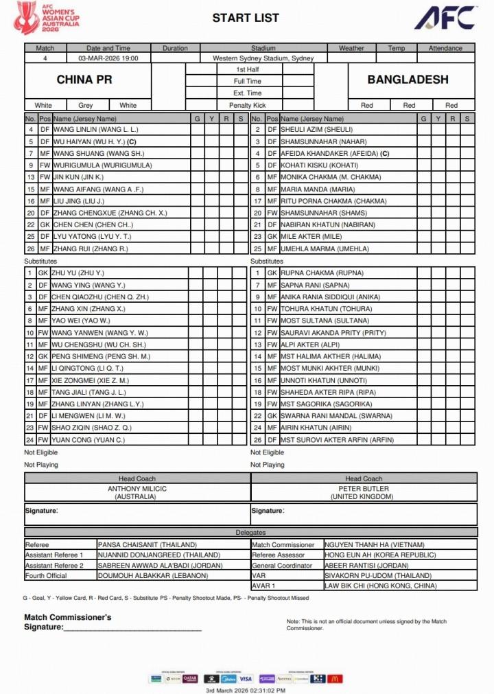 03-02 14:01北青:中国女足亚洲杯首战主裁来自泰国,已分析摸底孟加拉