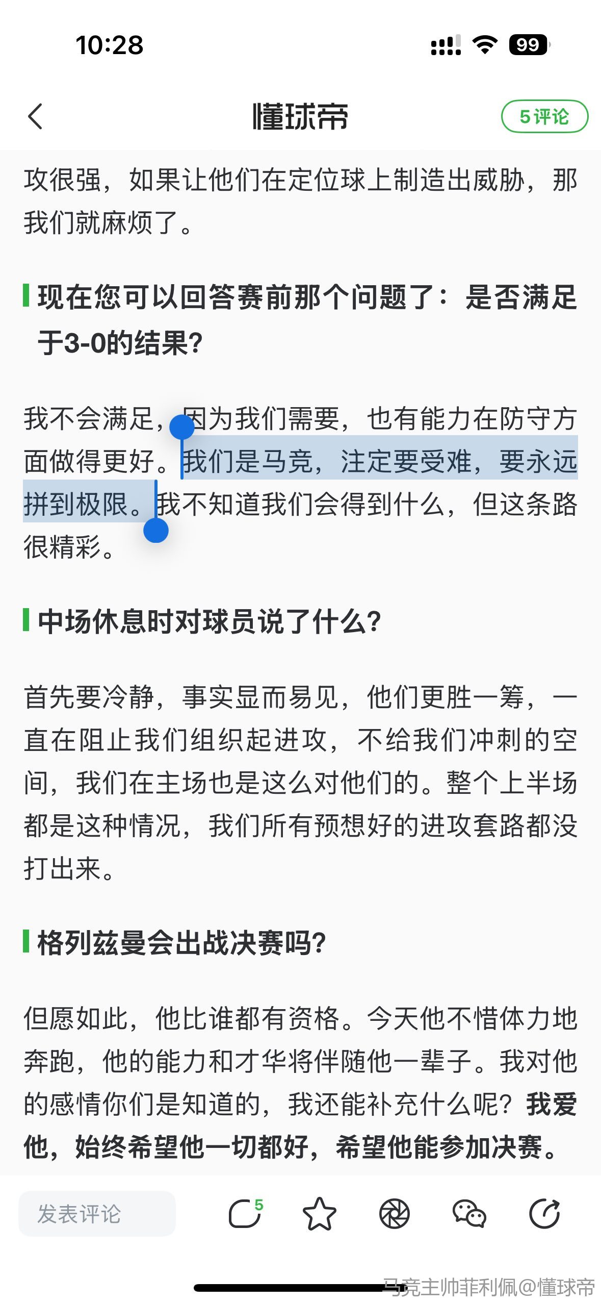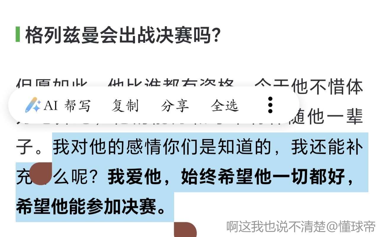 但愿如此,他比谁都有资格。今天他不惜体力地奔跑,他的能力和才华将伴随他一辈子。我对他的感情你们是知道的,我还能补充什么呢?我爱他,始终希望他一切都好,希望他能参加决赛。