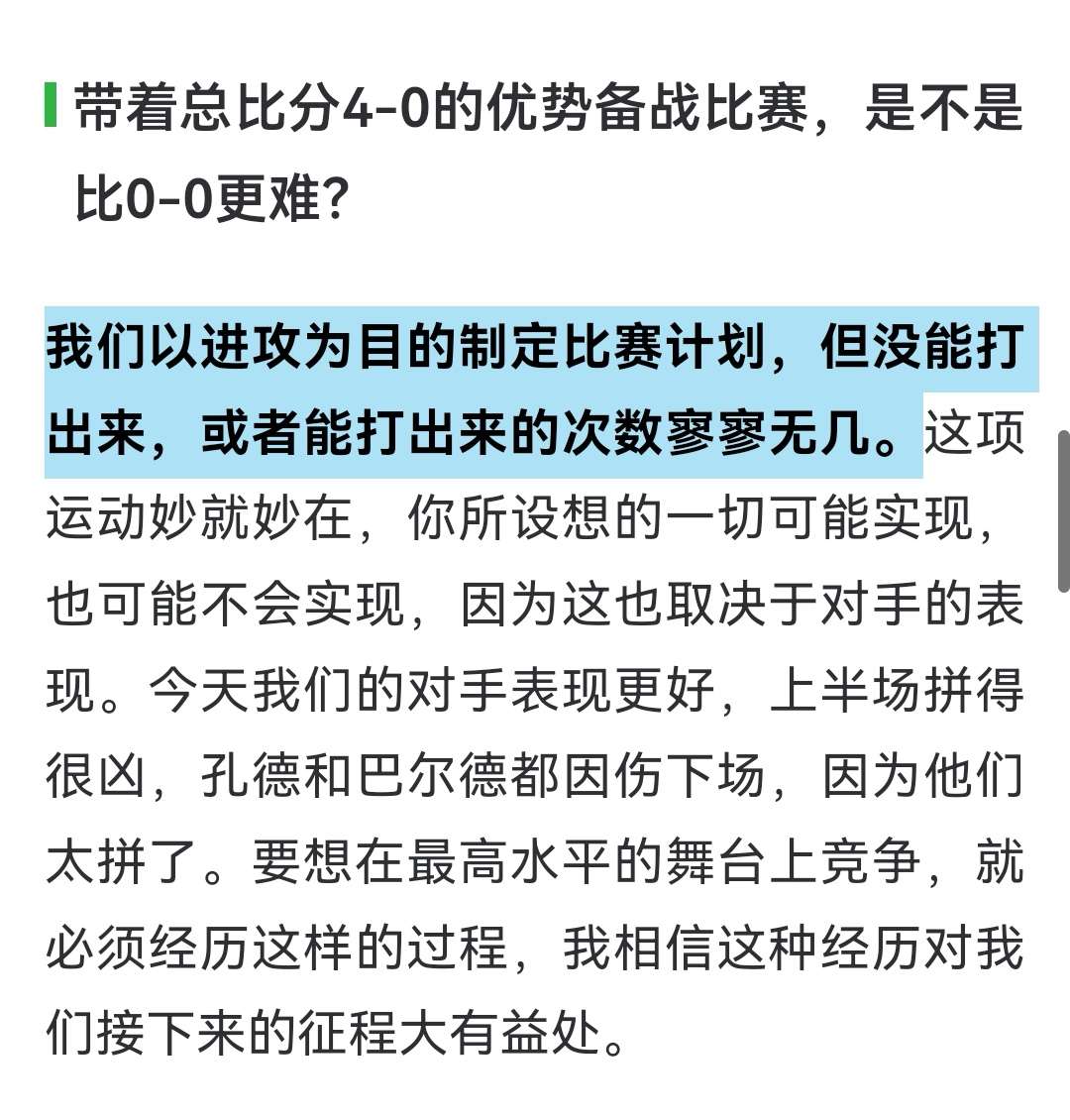 我们以进攻为目的制定比赛计划,但没能打出来,或者能打出来的次数寥寥无几。这项运动妙就妙在,你所设想的一切可能实现,也可能不会实现,因为这也取决于对手的表现。今天我们的对手表现更好,上半场拼得很凶,孔德和巴尔德都因伤下场,因为他们太拼了。要想在最高水平的舞台上竞争,就必须经历这样的过程,我相信这种经历对我们接下来的征程大有益处。