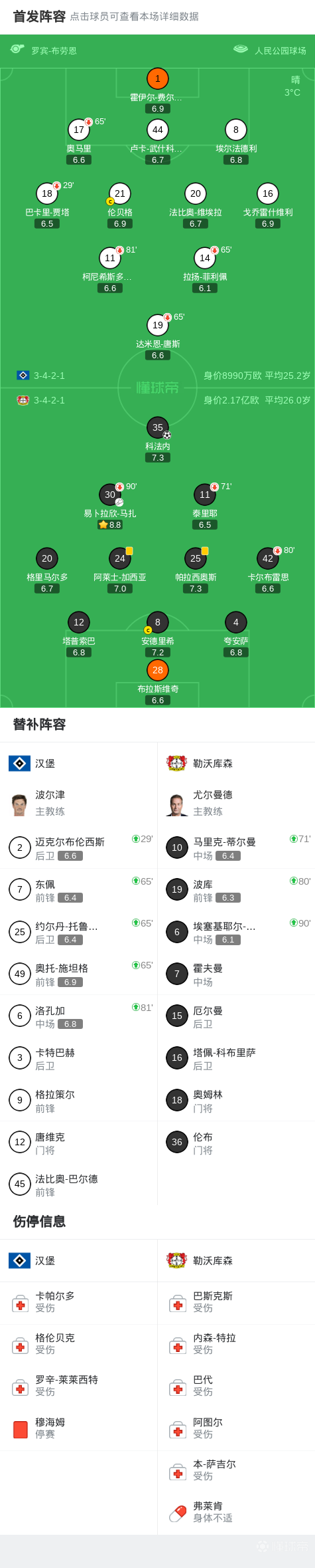 03-05 04:19汉堡vs勒沃库森:法比奥-维埃拉、卢卡-武什科维奇首发,格里马尔多、夸安萨出战