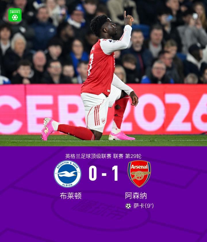 扫描下载懂球帝首页>动态> 剑南春|阿森纳1-0布莱顿扩大积分榜领先优势,萨卡一锤定音