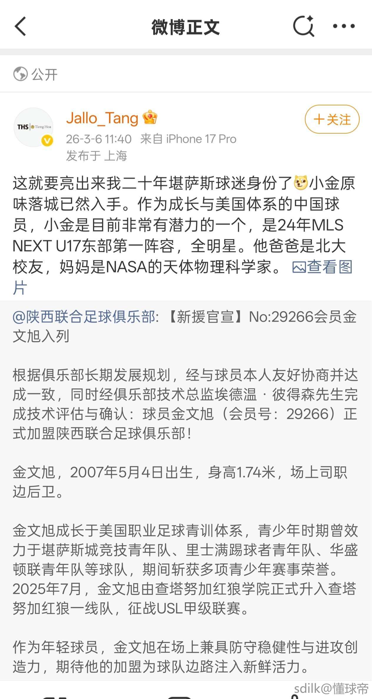 北京时间3月6日,陕西联合官方宣布,俱乐部签下美国青训体系培养的小将金文旭。