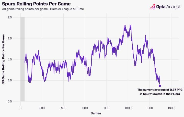 扫描下载懂球帝首页>动态> 热刺近38场联赛场均0.87分,为队史任何一段38场比赛中最少