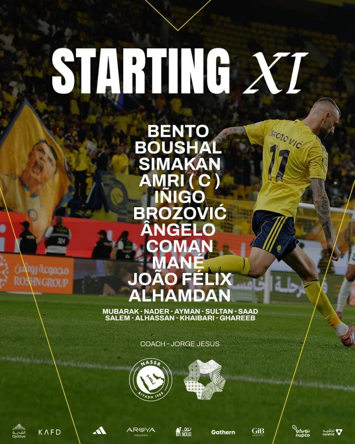 利雅得胜利首发:24-本托、12-纳瓦夫-布歇尔、3-西马坎、5-阿卜杜拉-阿姆里、26-伊尼戈-马丁内斯、11-布罗佐维奇、20-安热洛-博尔热斯、21-金斯利-科曼、10-马内、79-菲利克斯、9-阿卜杜拉-哈姆丹