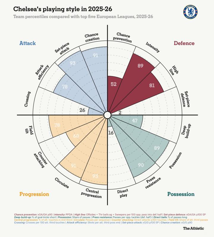 The Athletic最新更新的比赛风格分布图有助于将这一弱点置于背景中。虽然我们可以看到切尔西是一支强大的控球型球队,在马雷斯卡和罗塞尼尔指导下能够很好地传导球以创造高质量机会,但在防守定位球方面,他们发现自己处于欧洲五大联赛所有球队中垫底的2%之列。