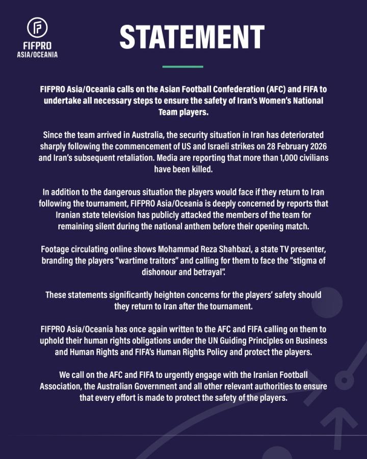 除了球员在本届赛事结束后返回伊朗可能面临的危险处境外,FIFPRO亚洲/大洋洲分部还对相关报道深感担忧——报道称伊朗国家电视台公开抨击球队成员,因为她们在首场比赛前奏国歌时保持沉默。