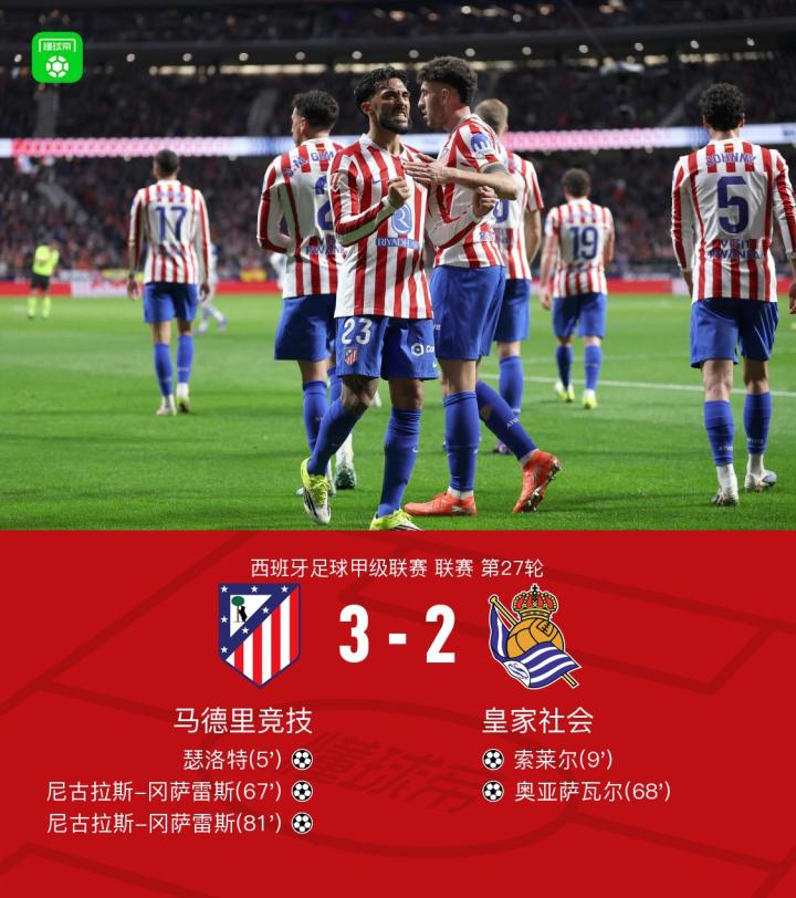 扫描下载懂球帝首页>动态> 马竞3-2皇家社会,冈萨雷斯替补双响,瑟洛特、奥亚萨瓦尔破门