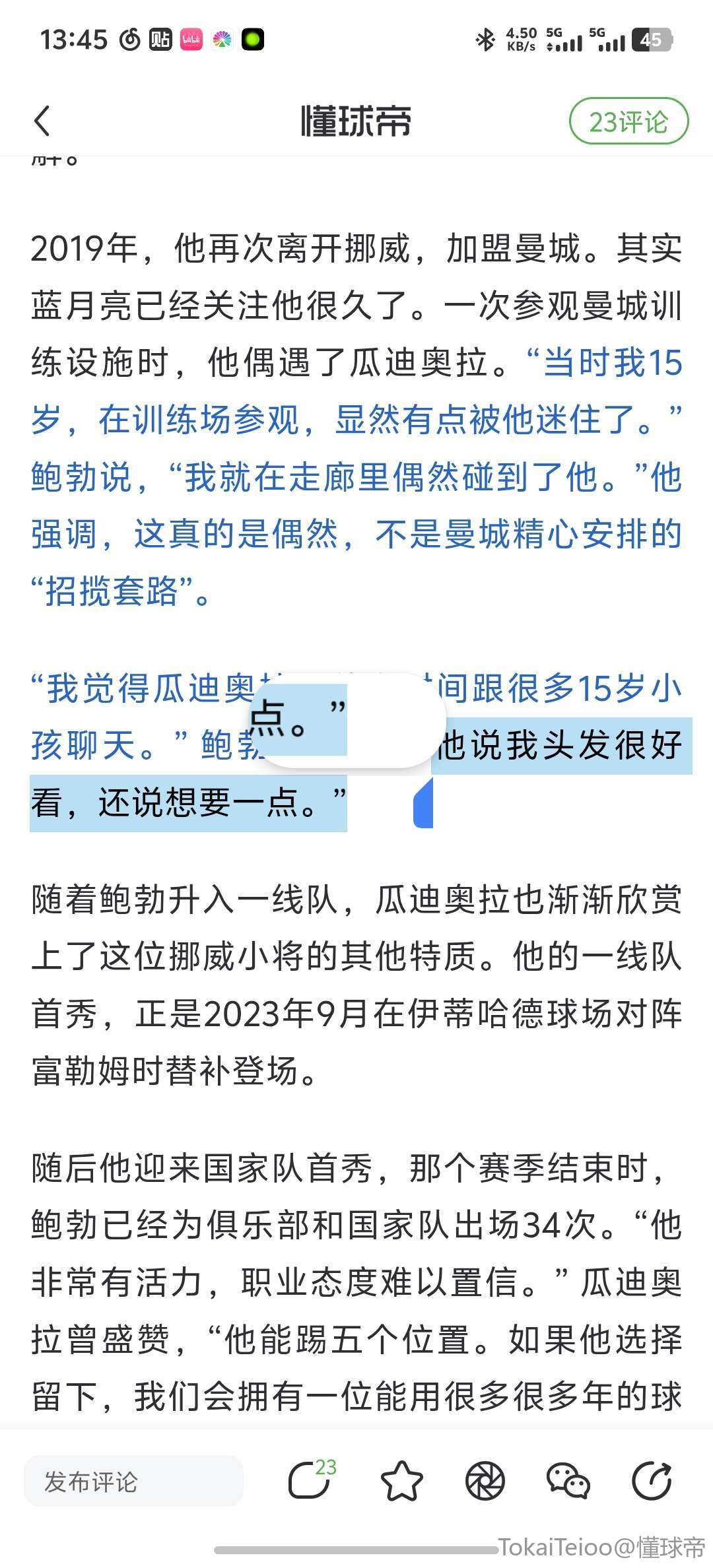 “我觉得瓜迪奥拉没什么时间跟很多15岁小孩聊天。” 鲍勃笑着说,“他说我头发很好看,还说想要一点。”