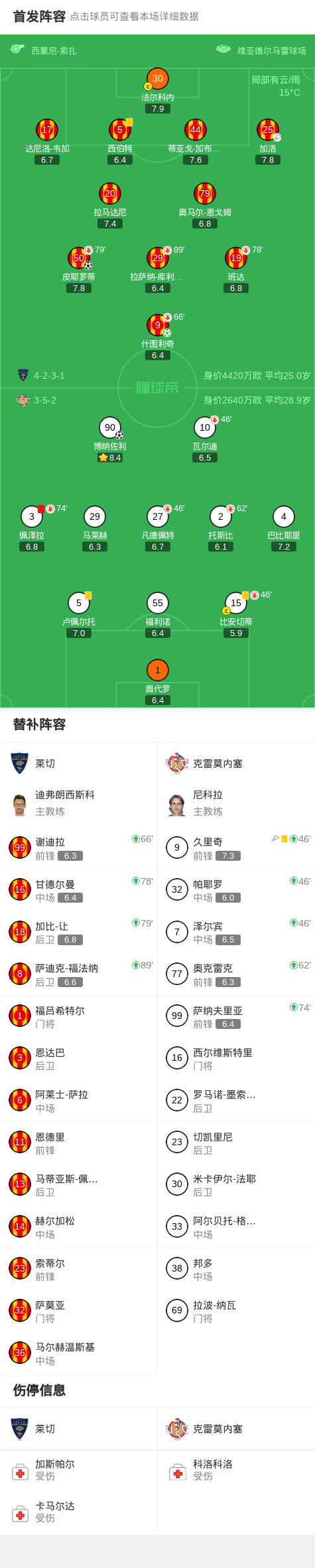 第22分钟,莱切球员加洛助攻皮耶罗蒂打入一球。