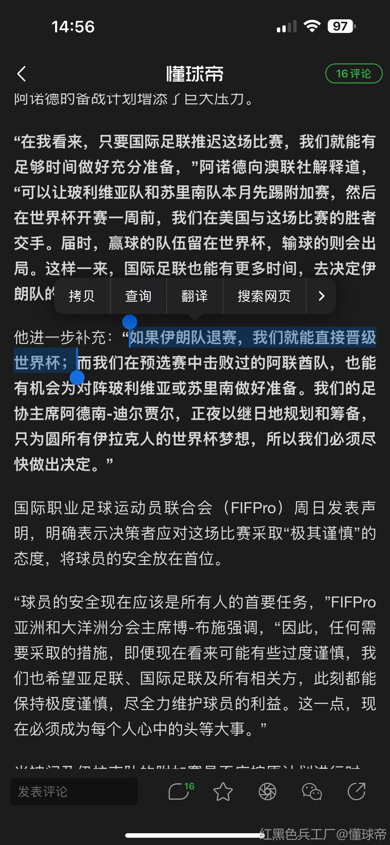 当被问及伊拉克队的附加赛是否应按原计划进行时,FIFPro秘书长亚历克斯-菲利普斯补充道:“这一切都取决于球员的安全,这是我们最关心的问题。从我们的角度来说,首要考量就是球员的安全能得到多大程度的保障,当然,其他相关因素也会纳入考虑范围。”