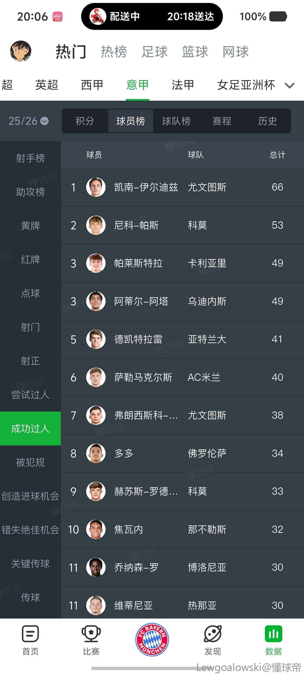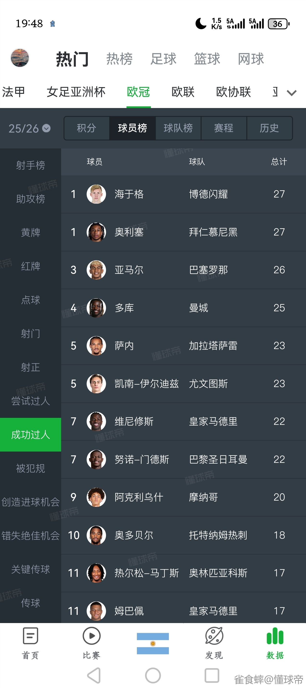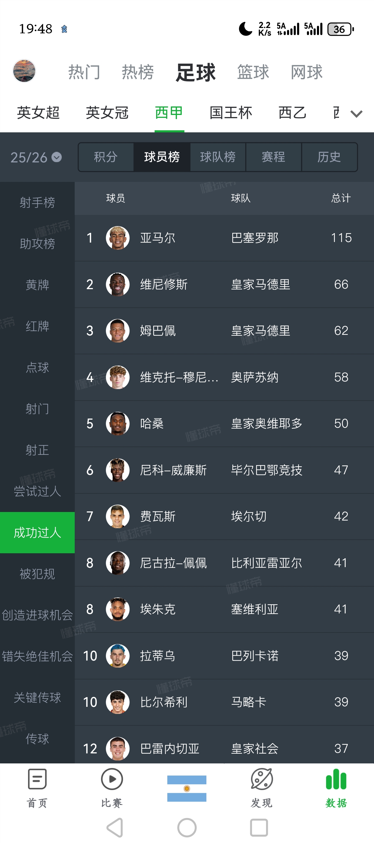 这排名绝对有问题,那个哈桑懂球帝数据才50次过人,在这一百多次过人了