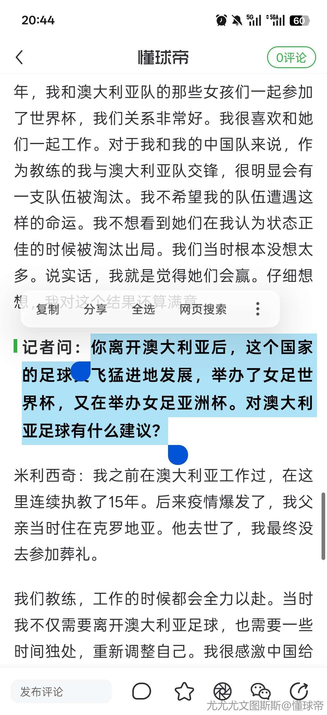 我们教练,工作的时候都会全力以赴。当时我不仅需要离开澳大利亚足球,也需要一些时间独处,重新调整自己。我很感激中国给了我这个机会,我非常享受这段经历。我显然全身心投入到我目前的角色中。我希望这支球队能取得好成绩,我相信我们能做到。我一直专注于此,但我相信澳大利亚队也有潜力。我一直希望她们能在比赛中取得好成绩。