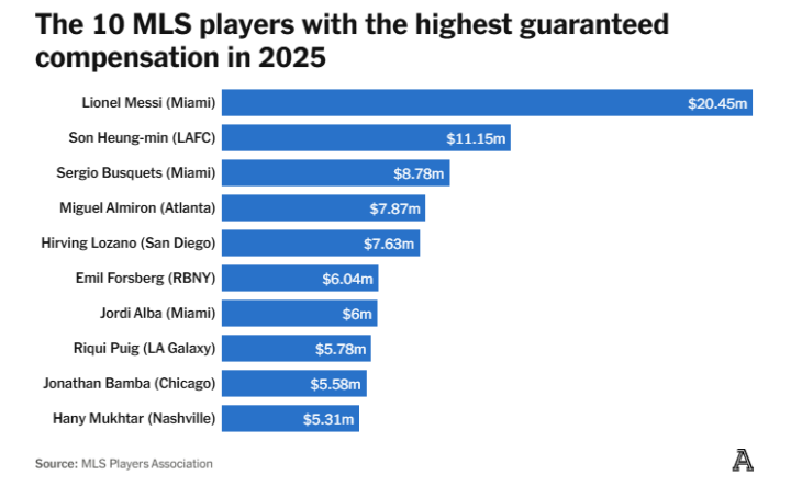 根据美职联球员工会(MLSPA)2025年10月公布的数据,梅西的基本工资为1,200万美元,加上合同期总奖金额年摊销后的保障薪酬达2,045万,远超联盟第二名孙兴慜(保障薪酬1,115万)。