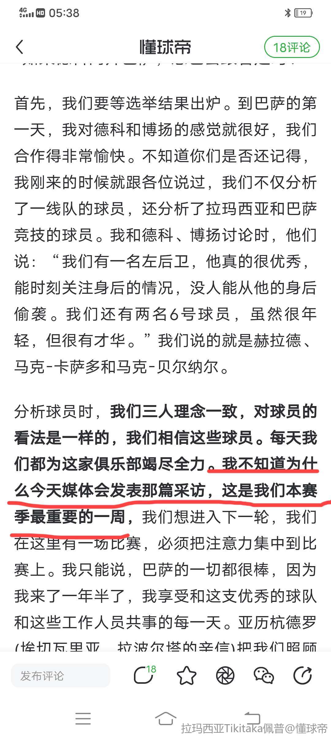 分析球员时,我们三人理念一致,对球员的看法是一样的,我们相信这些球员。每天我们都为这家俱乐部竭尽全力。我不知道为什么今天媒体会发表那篇采访,这是我们本赛季最重要的一周,我们想进入下一轮,我们在这里有一场比赛,必须把注意力集中到比赛上。我只能说,巴萨的一切都很棒,因为我来了一年半了,我享受和这支优秀的球队和这些工作人员共事的每一天。亚历杭德罗(埃切瓦里亚,拉波尔塔的亲信)把我们照顾得很好,我们有什么需要,他都会抓紧搞定。