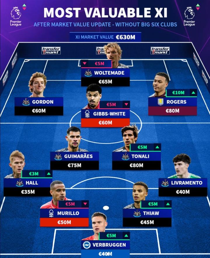扫描下载懂球帝首页>动态> 英超非BIG6球员最贵11人阵容:托纳利8000万领衔,纽卡7人入选