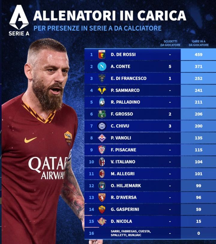 扫描下载懂球帝首页>动态> 意甲现任主帅球员生涯意甲出场数排名:德罗西、孔蒂前二