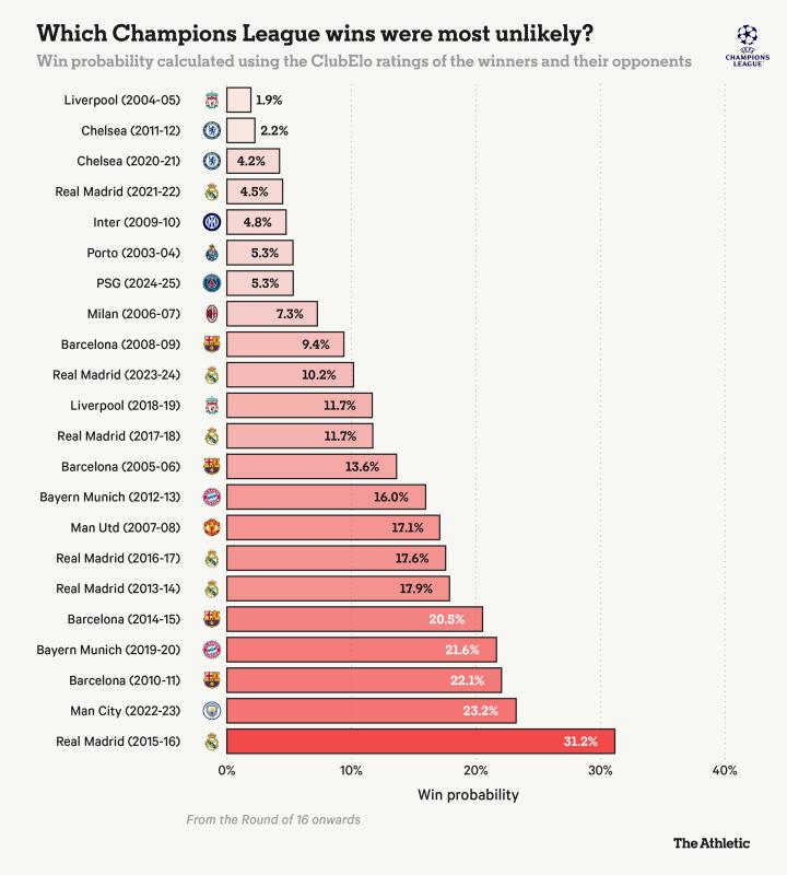 根据他们当时以及对手的ClubElo评分,他们夺冠的概率不到2%。切尔西在2012年的首座欧冠冠军同样出人意料,他们在半决赛和决赛中分别战胜了强大的巴塞罗那和拜仁慕尼黑。
