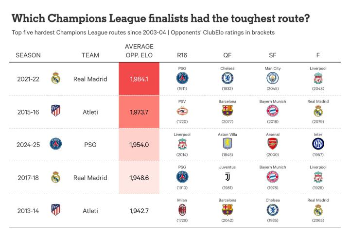 与过去历届欧冠征程相比,这条通往荣耀之路究竟有多轻松?为了回答这个问题,The Athletic借助ClubElo评分来衡量历年来欧冠球队的实力。ClubElo是由Lars Schiefler设计并维护的一套排名系统,基于与国际象棋排名相同的方法论。球队击败的对手越强,获得的积分就越多;击败的对手越弱,获得的积分就越少。简而言之,评分越高,代表球队实力越强。