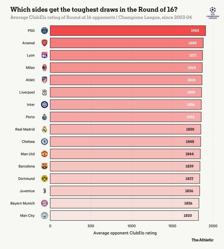 在所有参加过10次或以上16强比赛的球队中,根据对手的ClubElo评分,只有巴黎圣日耳曼平均遭遇的对手比阿森纳更强。