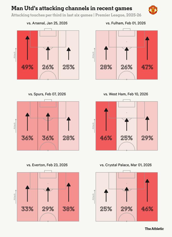 对阵水晶宫时,曼联在2025-26赛季左路进攻次数降至最低。