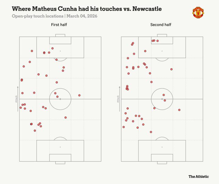 对阵纽卡斯尔时,库尼亚再次尝试踢得更像一名传统边锋。这位巴西前锋全场的触球分布图,与对阵水晶宫下半场十分接近,大量首次触球都发生在更深、更靠边路的位置。