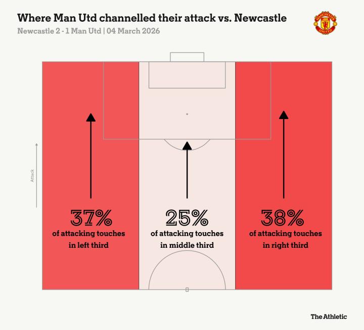 这与去年10月客战利物浦时形成鲜明对比。在安菲尔德,曼联在争抢高空球第一点、第二点时结构清晰,最终2-1取胜。而在圣詹姆斯公园,斗志昂扬的纽卡斯尔从一开始就掐断了曼联的所有快速推进。