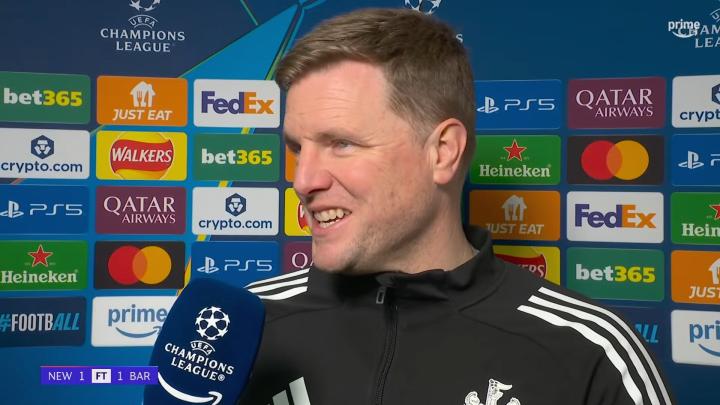 率队在欧冠1/8决赛首回合主场1-1战平巴塞罗那之后,纽卡斯尔联主教练埃迪-豪接受了来自亚马逊Prime Video的采访。