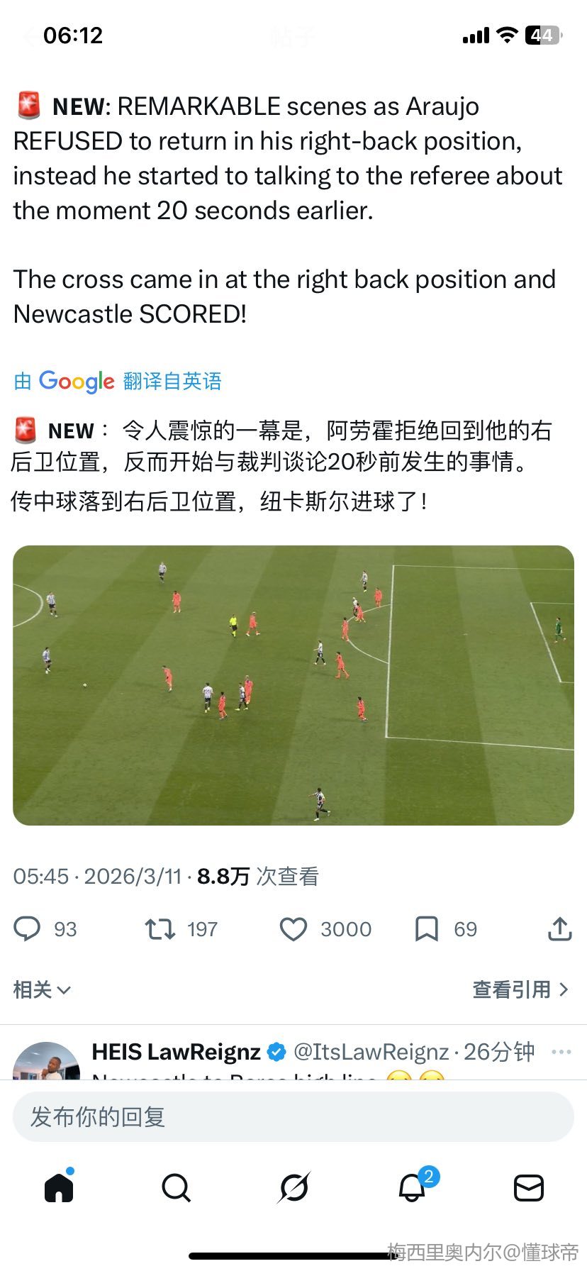 还是长点脑子吧 裁判示意比赛继续 还在那和裁判理论 最后被纽卡抓住机会进了