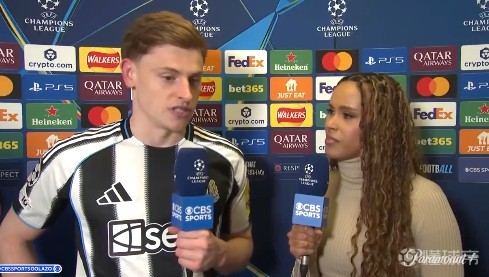 欧冠1/8决赛首回合,纽卡主场1-1战平巴萨,纽卡前锋哈维-巴恩斯赛后接受了CBS体育的采访。