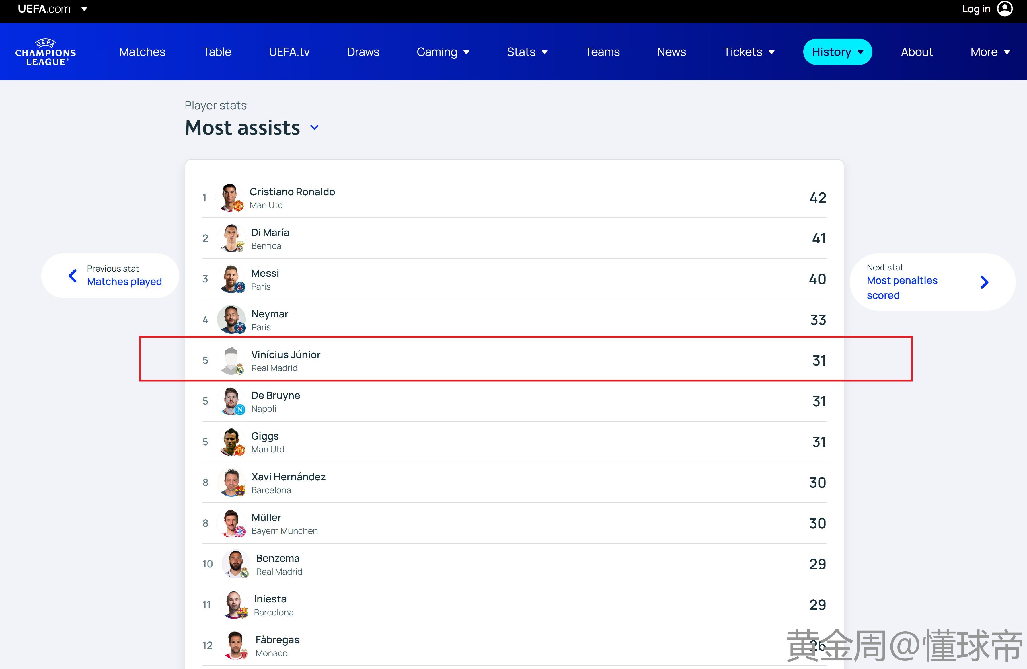 恭喜维尼欧冠31助追平偶像罗哥 并列皇马队史欧冠助攻王的纪录。